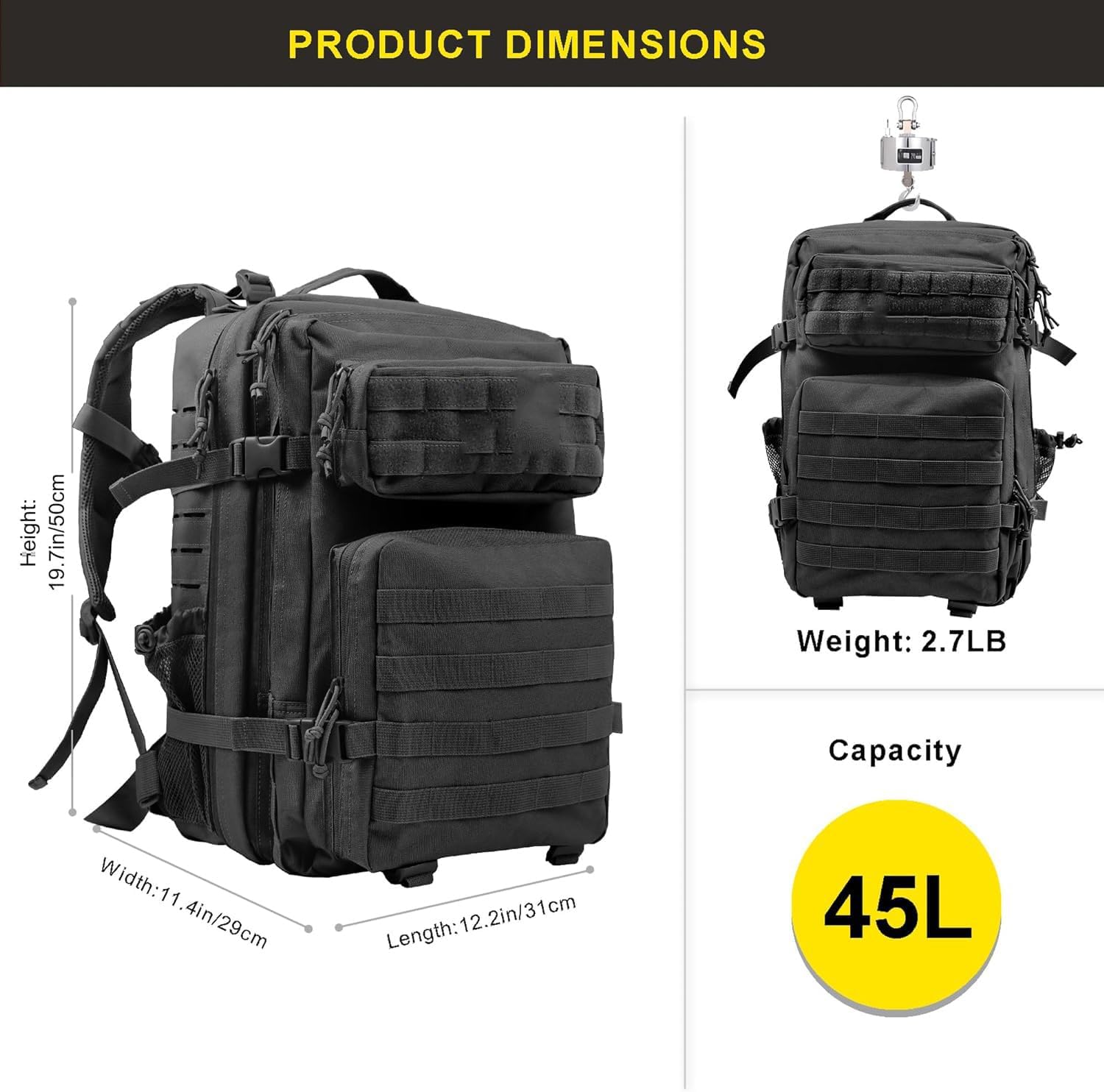 - Large Capacity: This military tactical backpack measures approximately 19.7 inches x 12.2 inches x 11.4 inches, making it spacious enough to hold all your essential gear. With a generous 45L capacity, it offers ample room for your outdoor equipment and meets your daily travel needs. It is perfect for various outdoor activities such as fitness, hiking, and travel